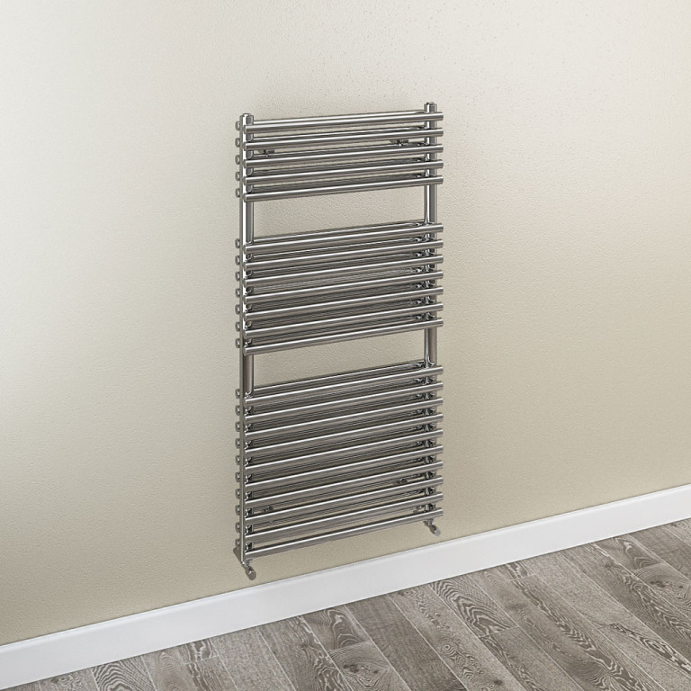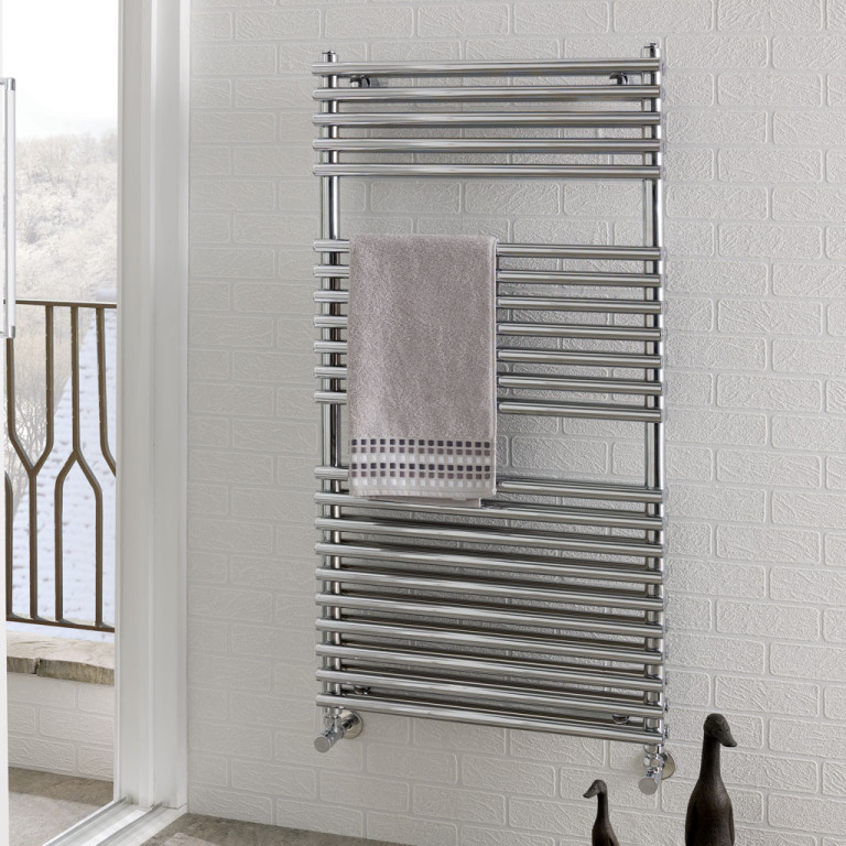 The double set of horizontal tubes allow for an alternative design to your standard bathroom towel warmer. A towel rail which keeps your towels warm as well as your whole bathroom.