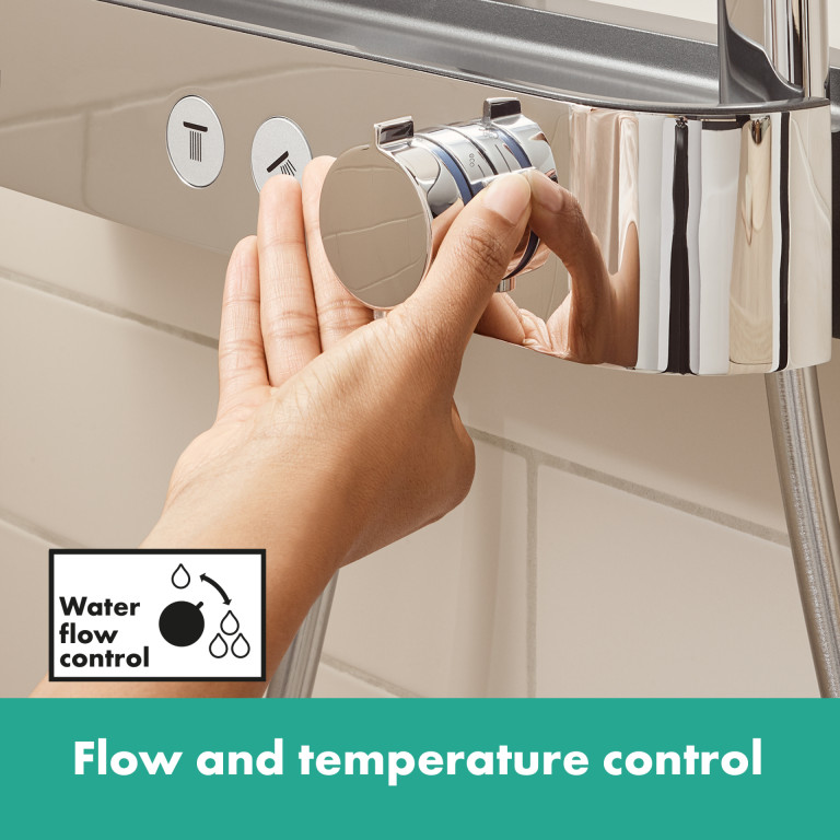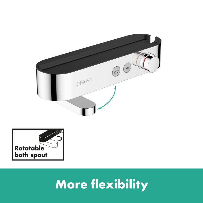 rotatable bath spout, designed to run 2 outlets, simultaneous utilisation by 2 outlets, temperature and volume control, Select push button on / off control for 2 outlets, CoolContact thermostat: Prevents the housing from heating up, making showering even safer, Maximum flow rate (at 3 bar): 18.7 l/min , Flow rate for bath spout (at 3 bar): 18.7 l/min , Flow rate of hand shower (at 3 bar): 15.9 l/min , Min. operating pressure: 1 bar , Max. operating pressure: 10 bar , safety stop at 40°C, Maximum temperature can be adjusted on installation, with isolated water conduction, Non-return valve, protected against backflow, according to DIN EN 1717, with silencer, Material handles: plastic , shelf made of plastic, Shelf colour: graphite , wall-mounted, Centre distance: 150 mm ± 12 mm , dirt filter included, thermostat is delivered with buttons hand shower and bath tub, if running with a pump, please specify a universal (negative head) pump