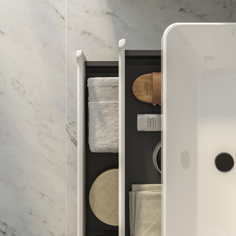 Bromont brings a contemporary feel to any bathroom with its rounded corners and integrated handles. Crafted with an emphasis on material quality, with an easy-to-clean ceramic basin, water-resistant matt finish and soft-close drawers. Bromont not only adds a touch of modern elegance to your bathroom but also prioritises functionality and quality.