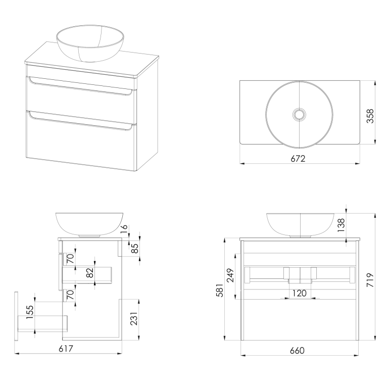 Bromont 2 Drawer Vanity 700mm with Worktop and Ceramic Sit-on Bowl - White Matt