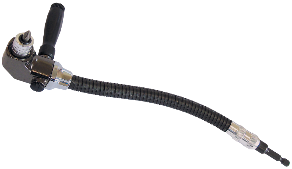 Download (0.12 MB)A right angle 25mm driver and magnetic bit holder to help loosen and tighten screws or fixings in the most inaccessible places, helping you achieve the seemingly impossible. Suitable for all 1/4" hexagon insert bits and for drills 10.8V - 18V. 1/4" hex shank for quick release and zinc alloy housing for high torque applications. Max 2000 rpm. Head rotates 360 degrees enabling the user to access any tight space. Adjustable handle can be fixed at 0, 45 or 90 degrees providing stability when screwing. Suitable for up to 57Nm.