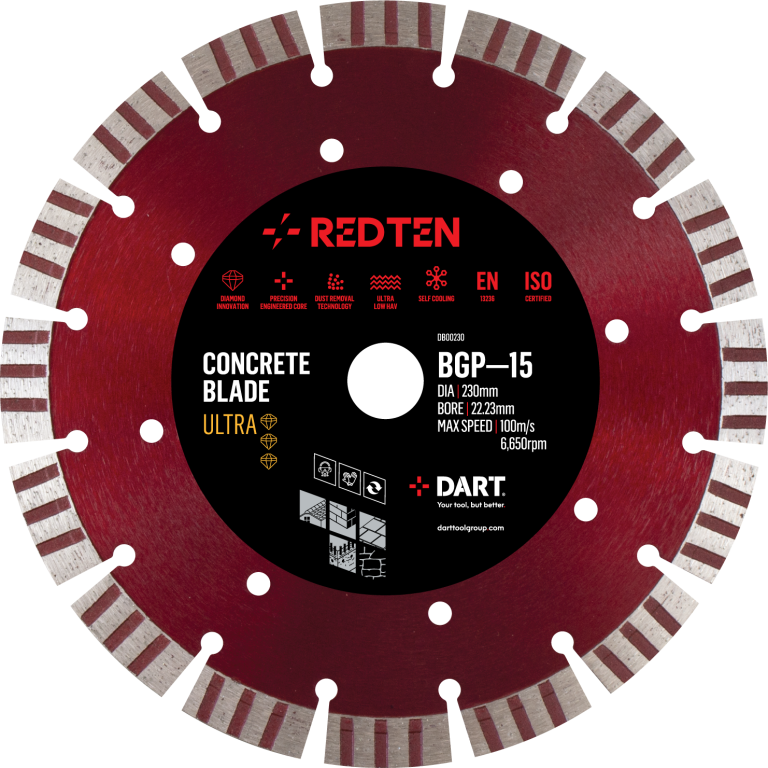 Ultra performance concrete and general purpose blade with large 15mm long life diamond turbo segment for all concrete applications. Cuts all concrete products: bricks, paving, stone, roof tiles, asphalt and macadam. Ideal for groundwork and civil engineers.