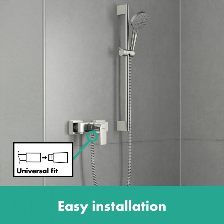 With its distinctive design, the Vernis Shape single lever shower mixer (exposed installation) is the perfect tap for modern shower solutions on a minimal budget. The exposed installation single lever tap is perfect for problem-free bathroom renovations. It can be screwed on to existing standard S connections in no time at all (size: G ½. DN15). Equally as easy: All standard shower hoses fit the water outlet for the shower head. With its flow rate of up to 15.7 l/min (at 3 bar), the tap guarantees almost instantaneous fun with water in the home bathroom.