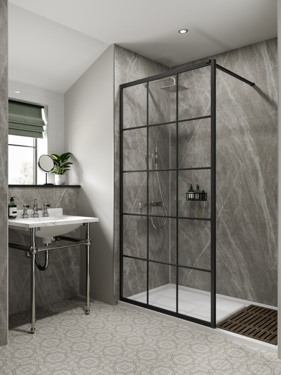 Soapstone Stellar from the Linda Barker Collection of waterproof bathroom wall panels is a gloss panel designed to look and feel like polished marble. With warm grey tones this panel pairs beautifully with Creamy White from the Neutrals collection.